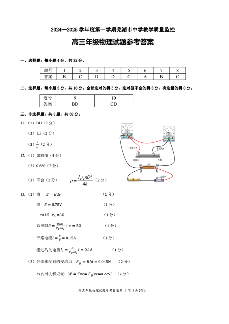 安徽省芜湖市2024-2025学年上学期1月高三期末考试物理答案