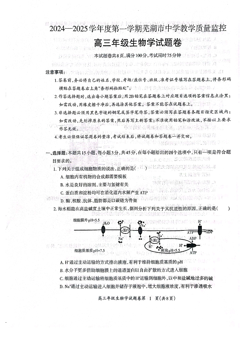安徽省芜湖市2024-2025学年上学期1月高三期末考试生物+答案
