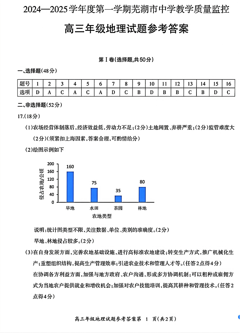 安徽省芜湖市2024-2025学年上学期1月高三期末考试地理答案
