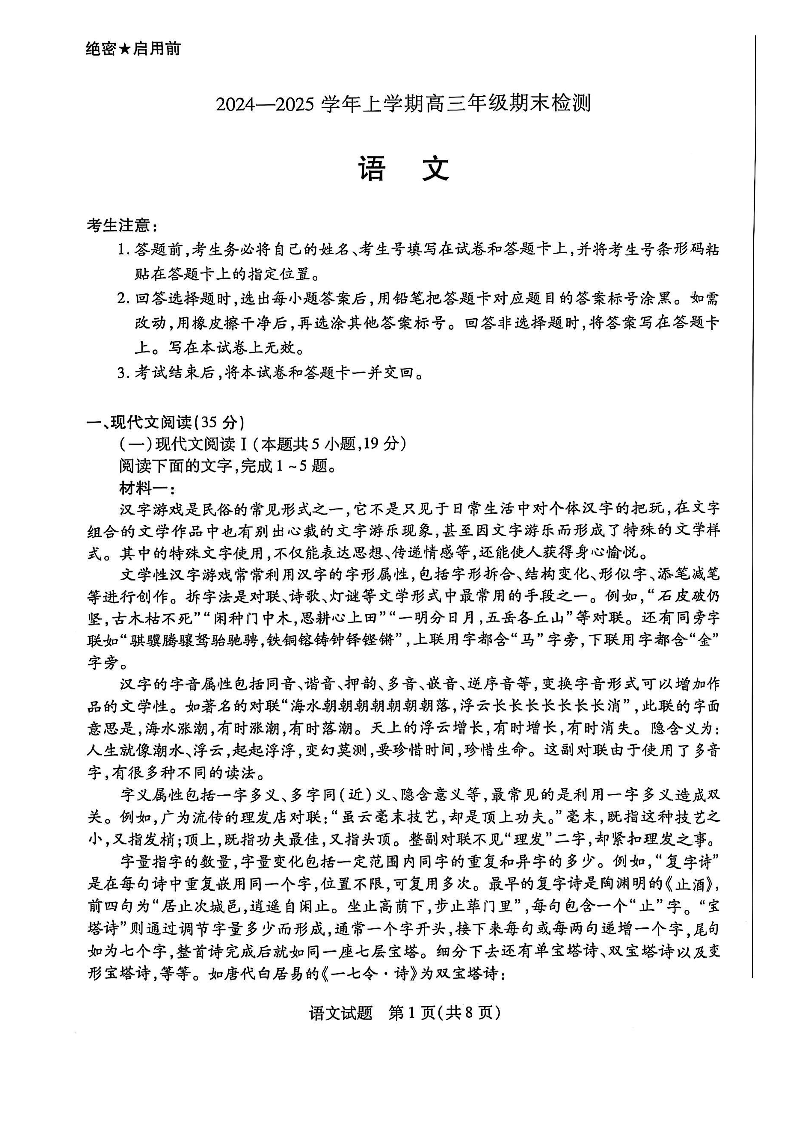安徽省区域高中2024-2025学年上学期1月高三期末检测语文