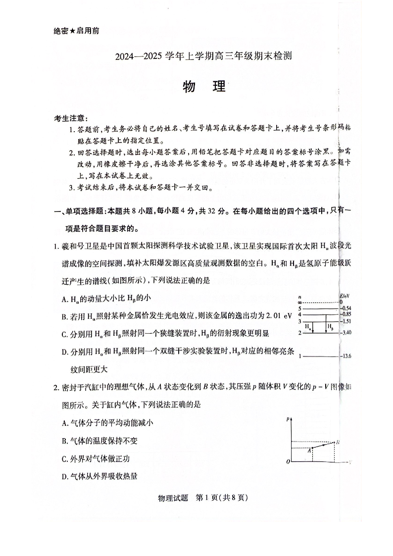 安徽省区域高中2024-2025学年上学期1月高三期末检测物理