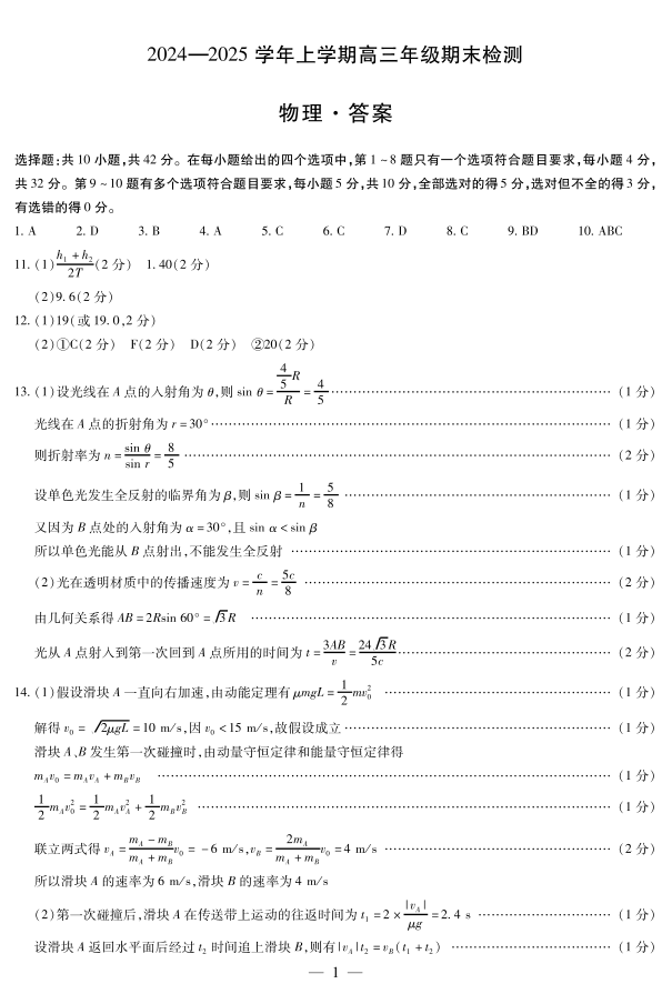 安徽省区域高中2024-2025学年上学期1月高三期末检测物理答案