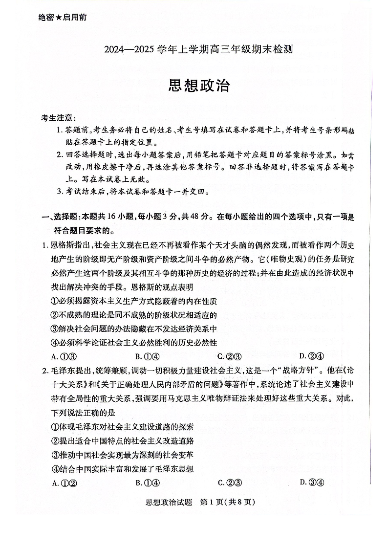 安徽省区域高中2024-2025学年上学期1月高三期末检测政治