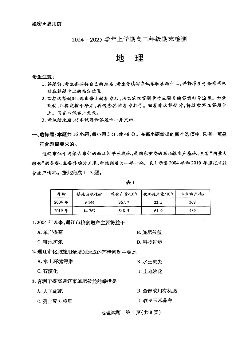 安徽省区域高中2024-2025学年上学期1月高三期末检测地理
