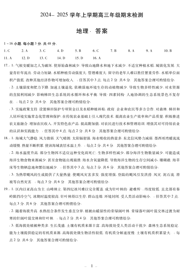 安徽省区域高中2024-2025学年上学期1月高三期末检测地理答案