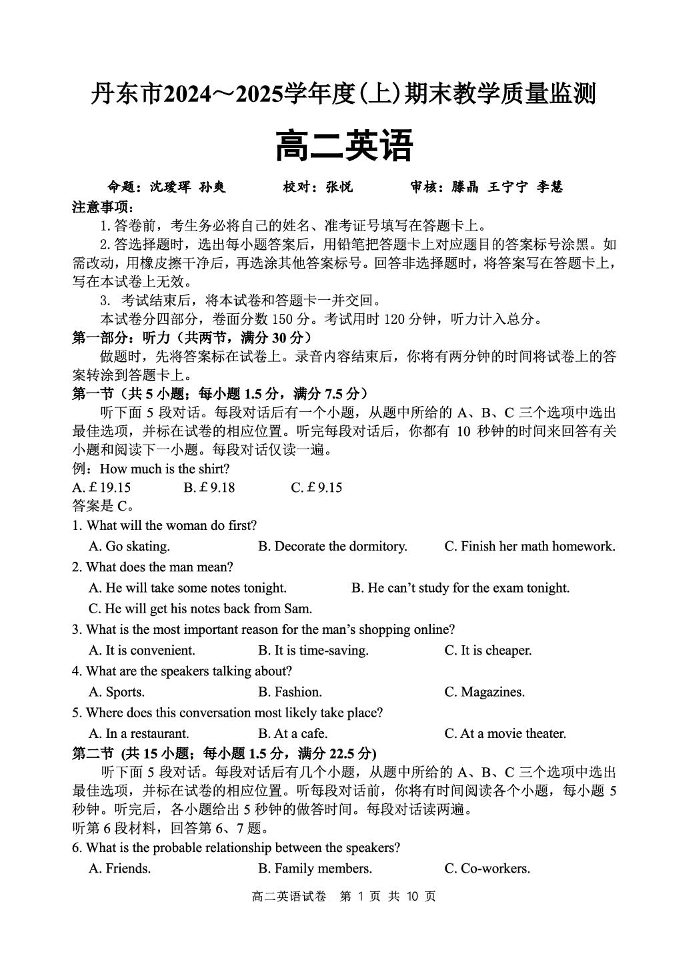 辽宁省丹东市2024-2025学年上学期高二期末教学质量监测英语+答案