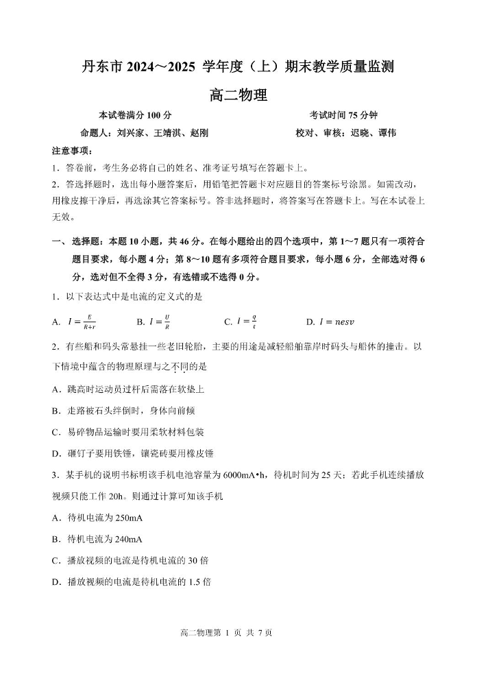 辽宁省丹东市2024-2025学年上学期高二期末教学质量监测物理+答案