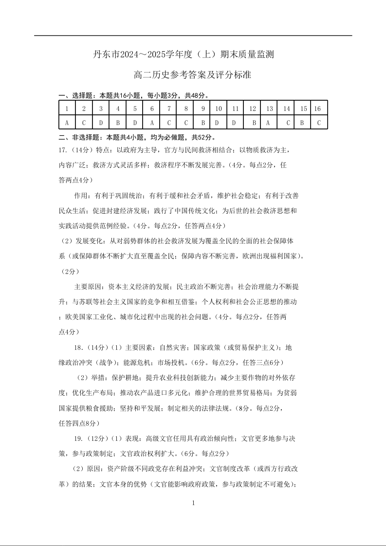 辽宁省丹东市2024-2025学年上学期高二期末教学质量监测历史答案