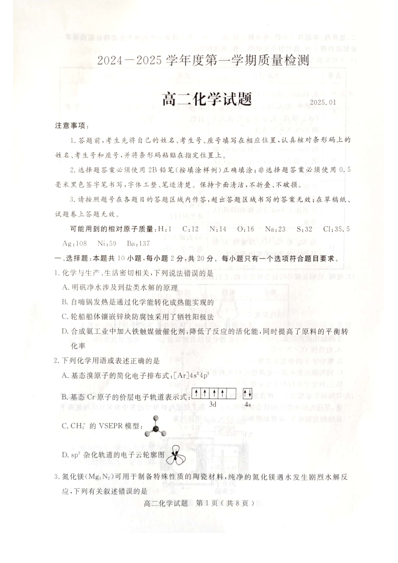 山东省济宁市2024-2025学年上学期1月高二教学质量检测化学+答案