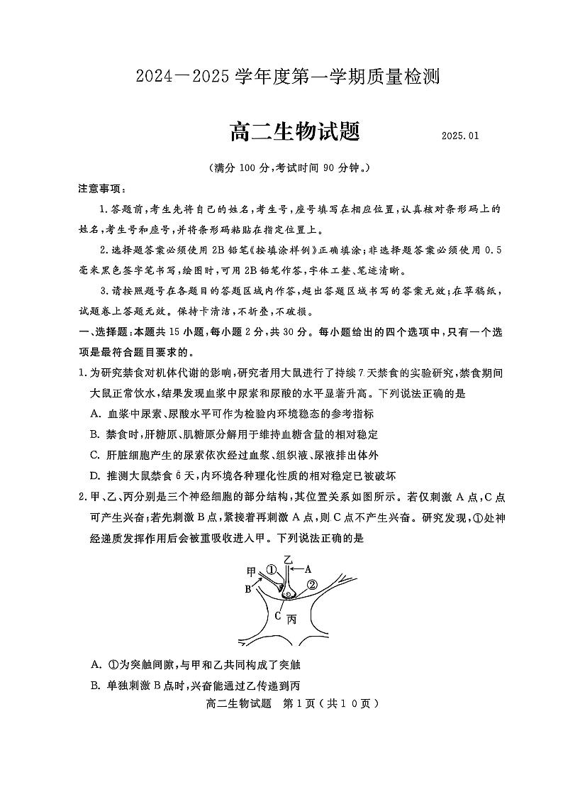 山东省济宁市2024-2025学年上学期1月高二教学质量检测生物