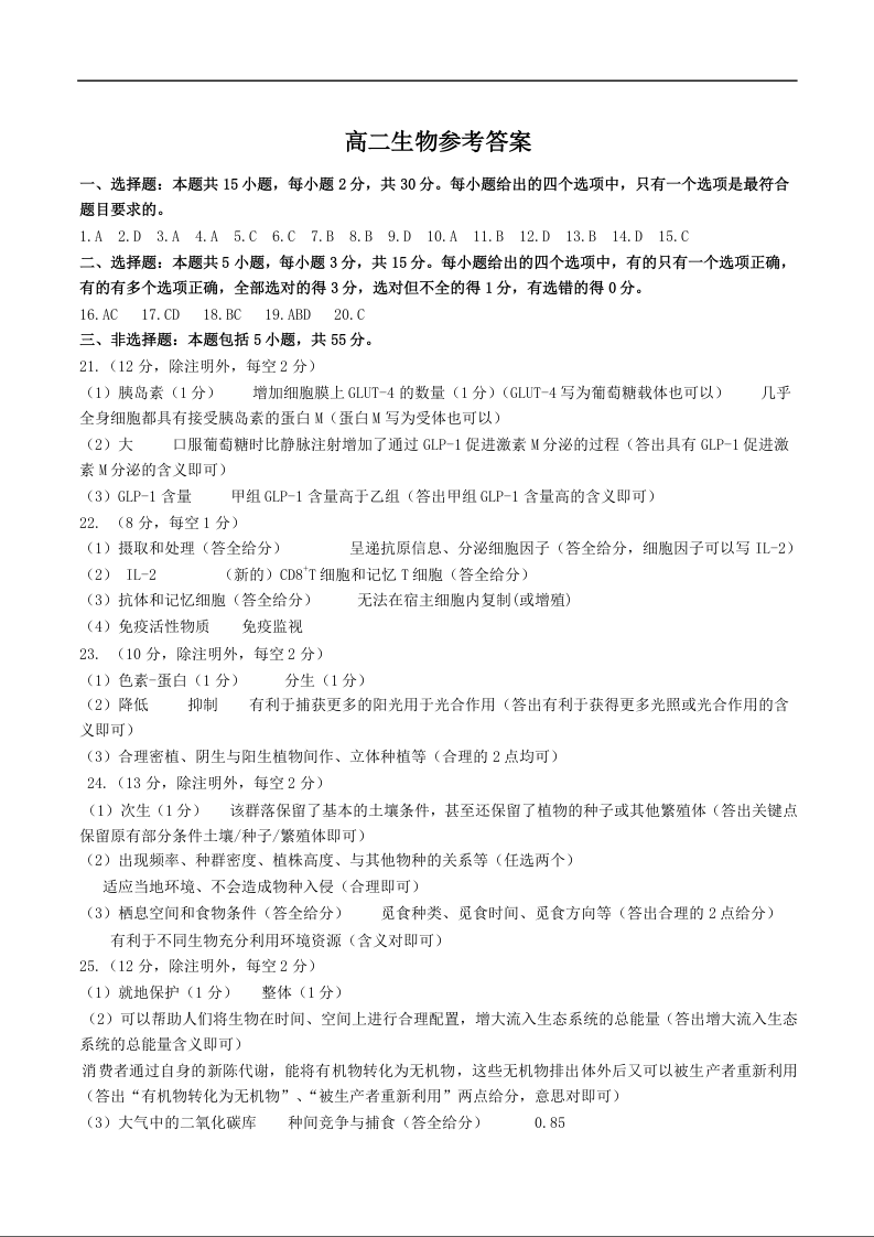 山东省济宁市2024-2025学年上学期1月高二教学质量检测生物答案