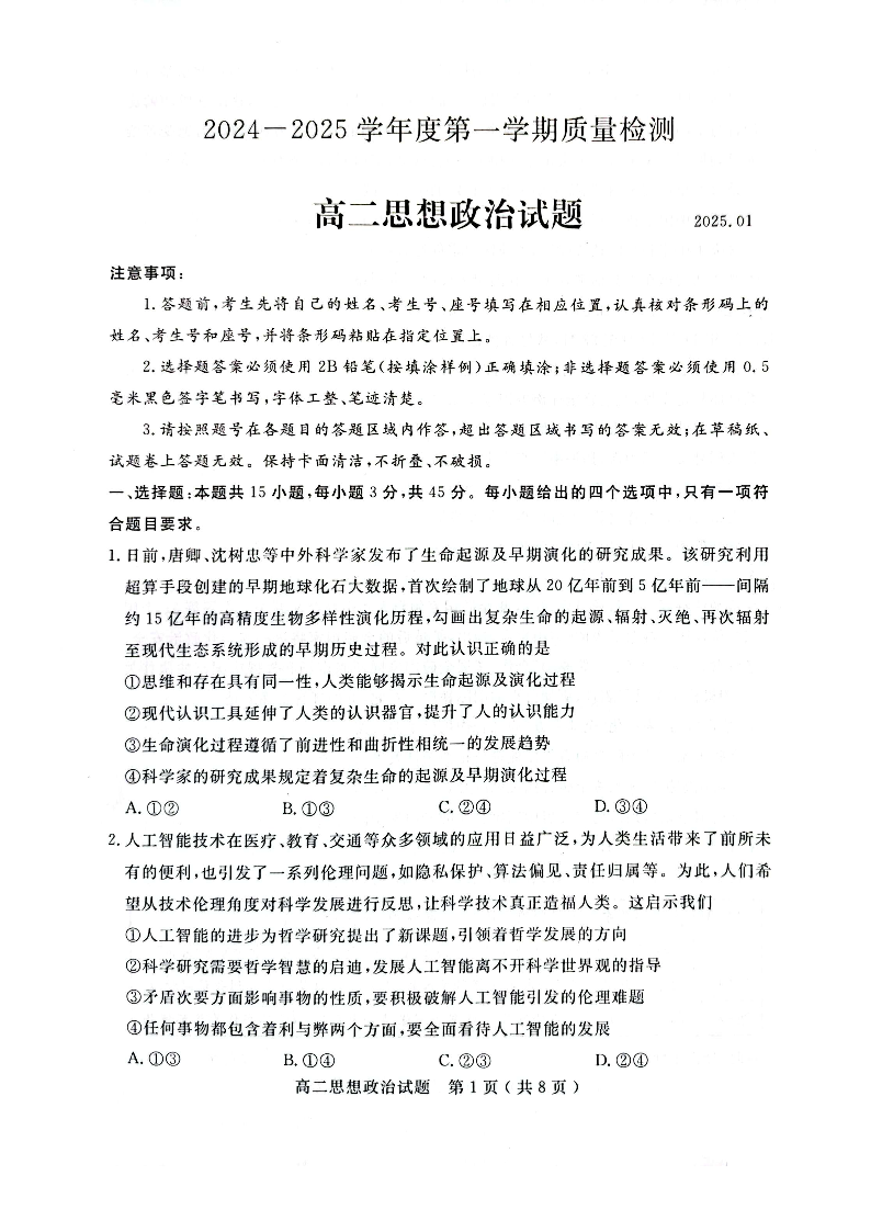 山东省济宁市2024-2025学年上学期1月高二教学质量检测政治+答案