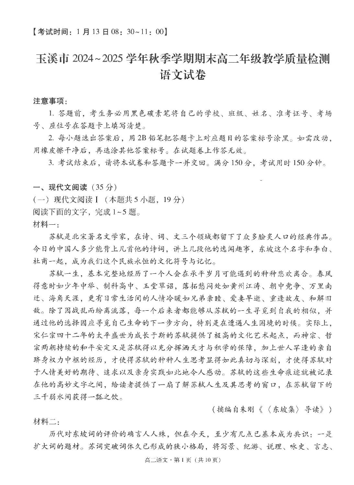 云南省玉溪市2024-2025学年上学期高二期末教学质量检测语文+答案