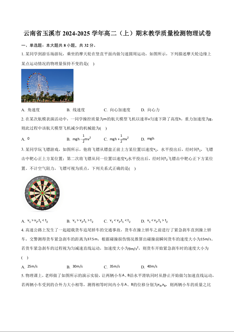 云南省玉溪市2024-2025学年上学期高二期末教学质量检测物理+答案