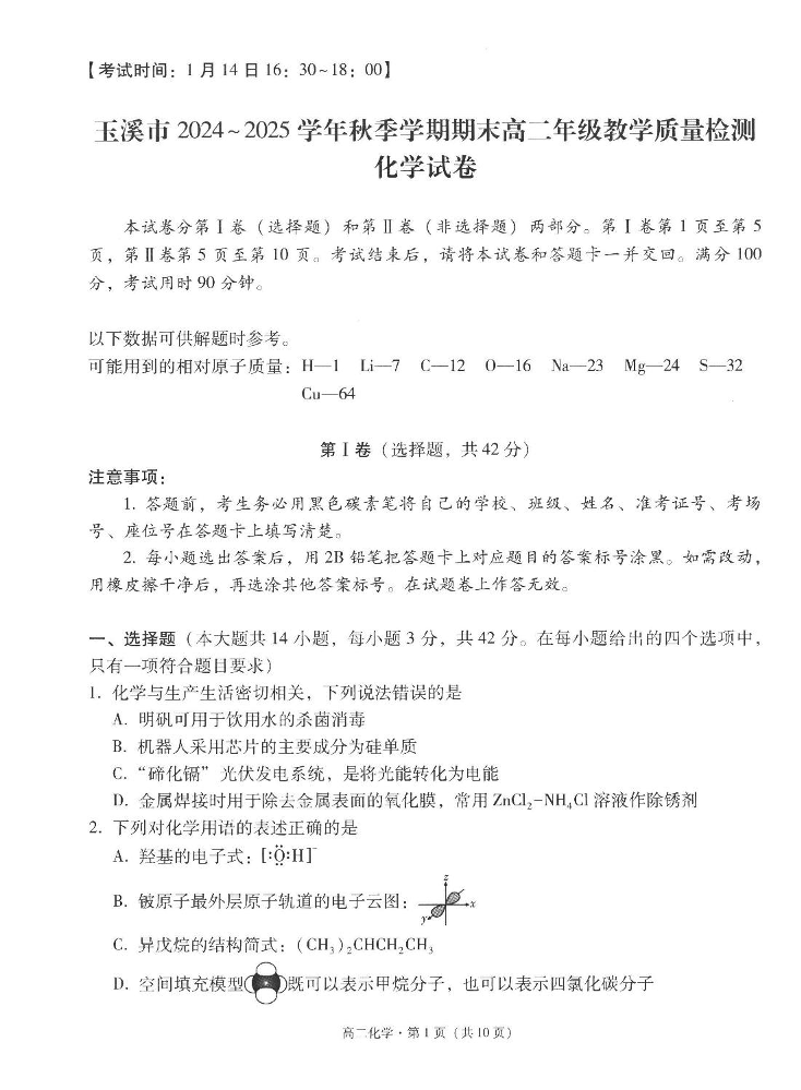 云南省玉溪市2024-2025学年上学期高二期末教学质量检测化学+答案