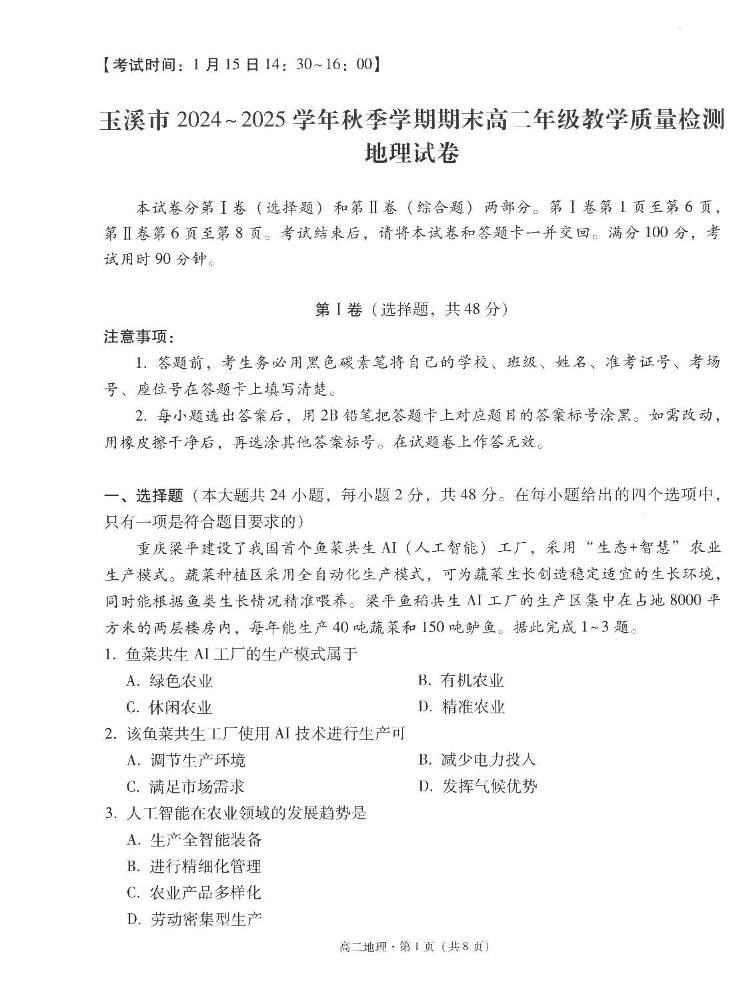 云南省玉溪市2024-2025学年上学期高二期末教学质量检测地理+答案