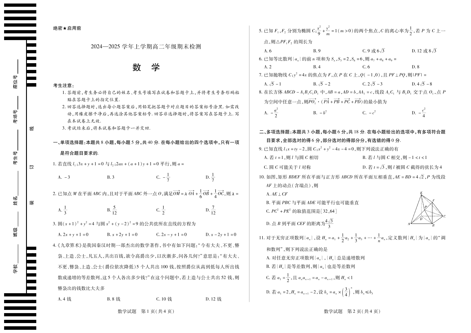 安徽区域高中2024-2025学年高二上学期期末检测数学