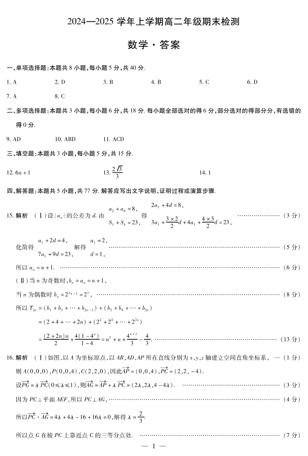 安徽区域高中2024-2025学年高二上学期期末检测数学答案
