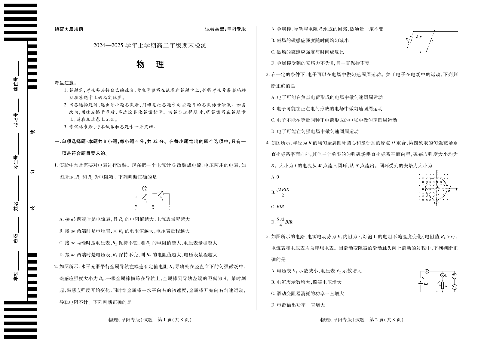 安徽区域高中2024-2025学年高二上学期期末检测(阜阳专版)物理