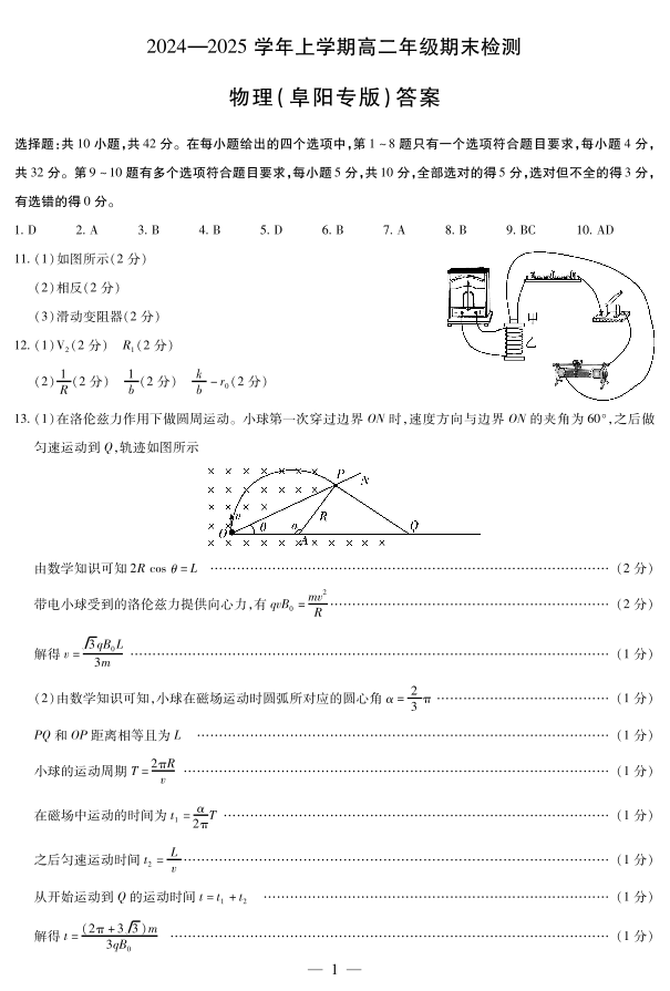 安徽区域高中2024-2025学年高二上学期期末检测(阜阳专版)物理答案