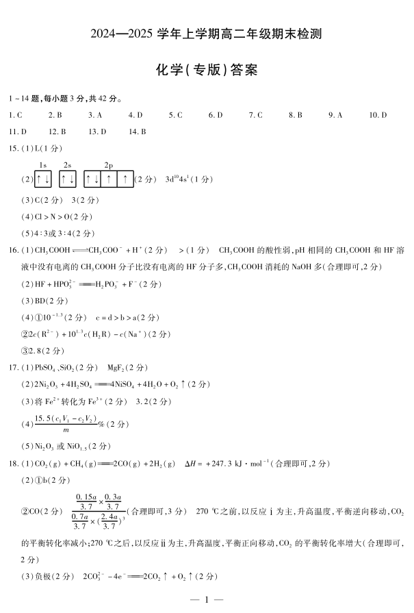 安徽区域高中2024-2025学年高二上学期期末检测(专版)化学答案