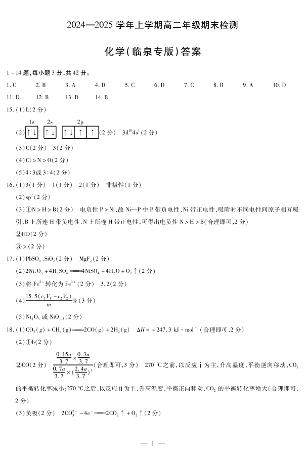 安徽区域高中2024-2025学年高二上学期期末检测(临泉专版)化学答案