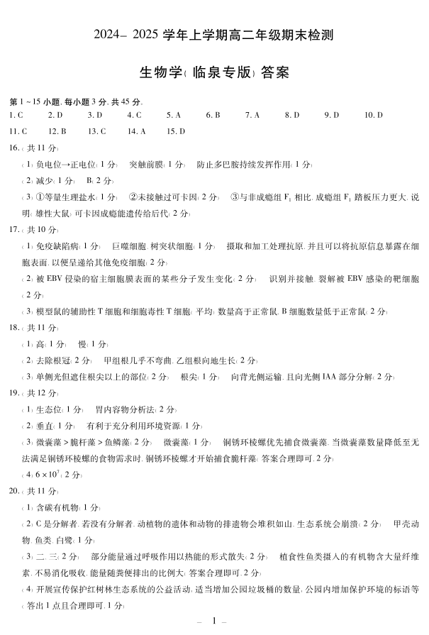 安徽区域高中2024-2025学年高二上学期期末检测(临泉专版)生物答案