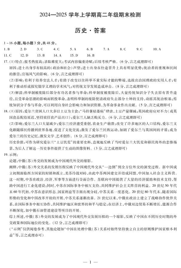 安徽区域高中2024-2025学年高二上学期期末检测历史答案