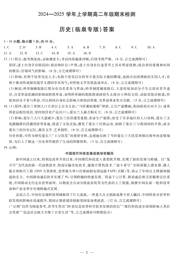安徽区域高中2024-2025学年高二上学期期末检测(临泉专版)历史答案