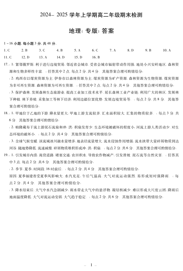 安徽区域高中2024-2025学年高二上学期期末检测(专版)地理答案