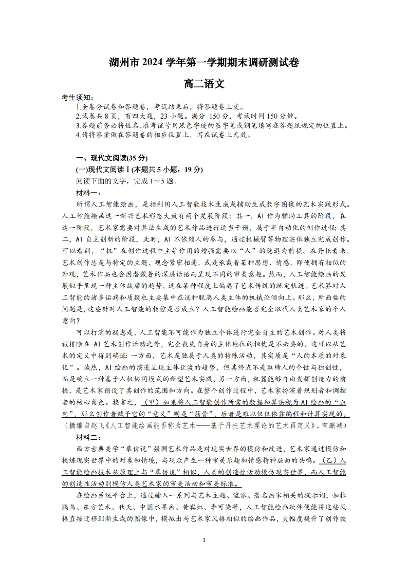 浙江省湖州市2024-2025学年上学期高二期末调研测试语文+答案