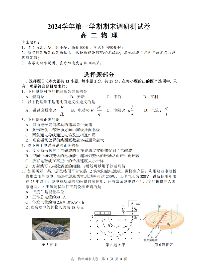 浙江省湖州市2024-2025学年上学期高二期末调研测试物理+答案