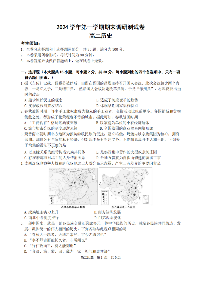 浙江省湖州市2024-2025学年上学期高二期末调研测试历史+答案