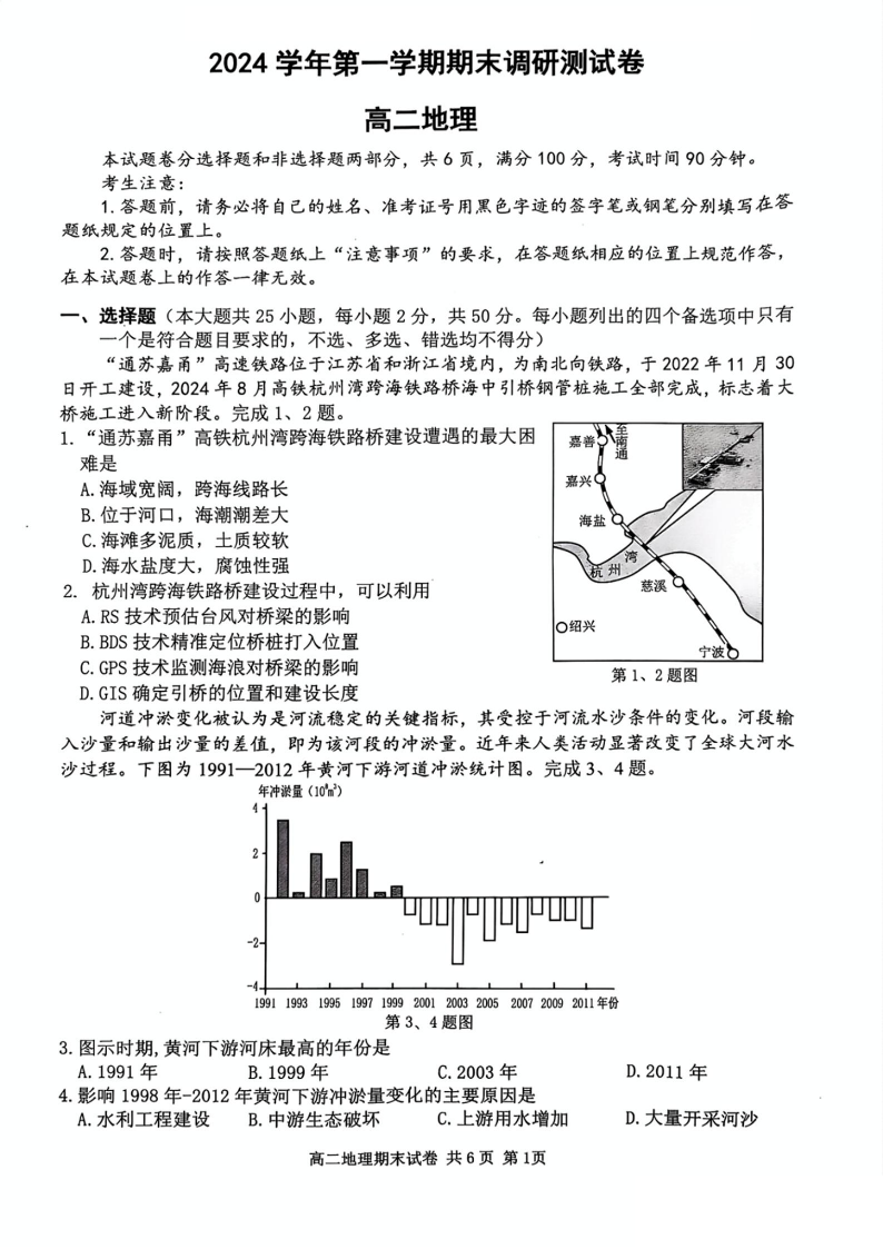 浙江省湖州市2024-2025学年上学期高二期末调研测试地理+答案