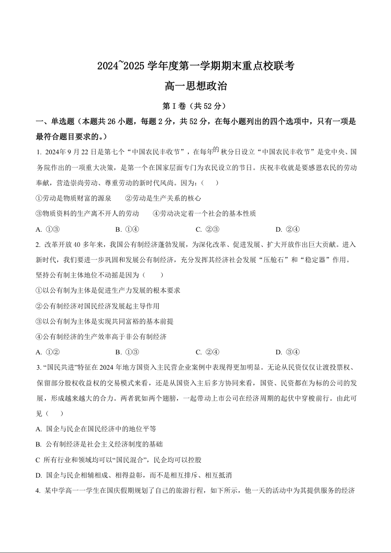 天津市五区县重点校2024-2025学年上学期1月高一期末联考政治+答案