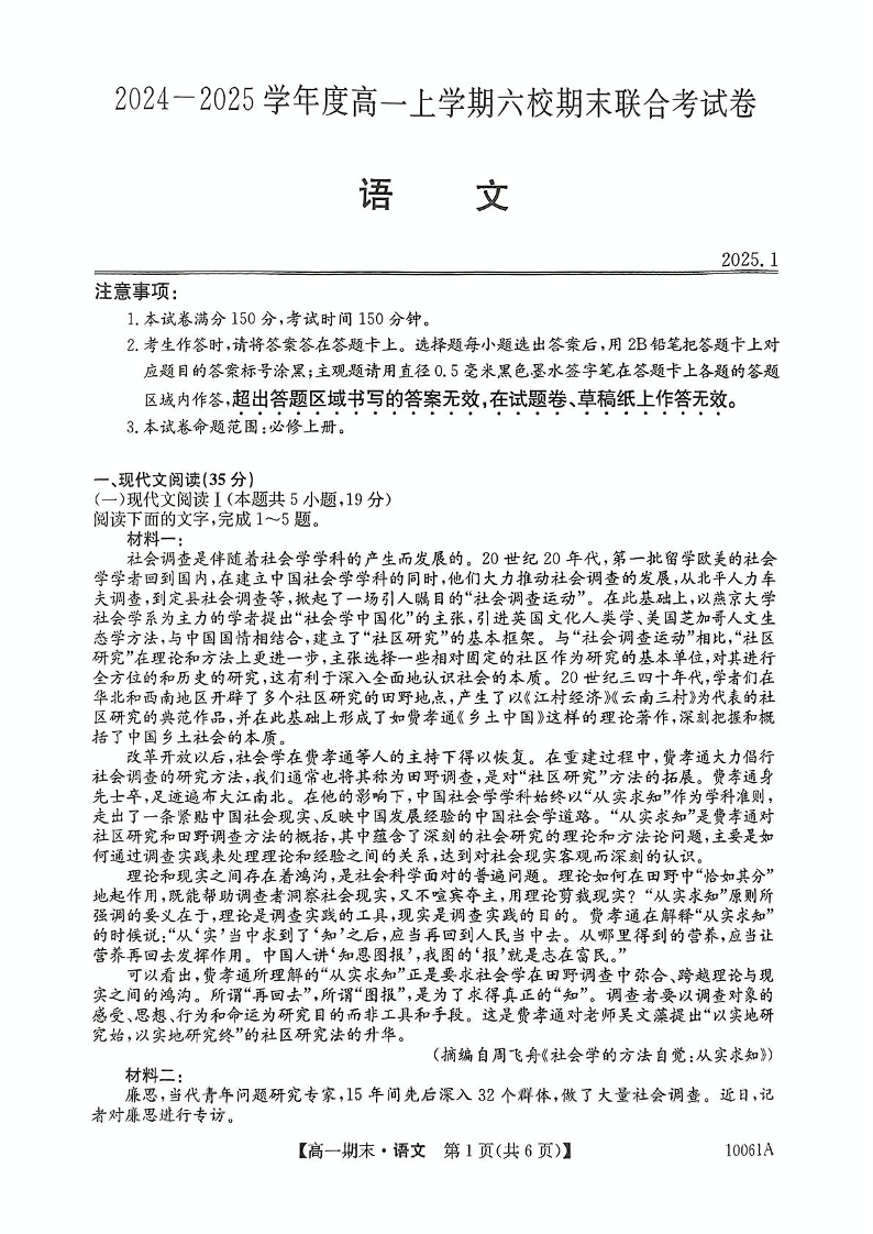 黑龙江省哈尔滨市六校2024-2025学年上学期高一期末联考语文+答案