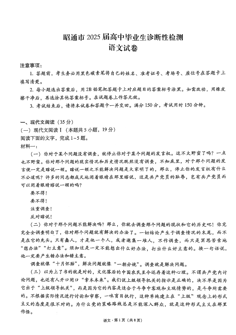 云南省昭通市2025届高三上学期1月诊断性检测语文