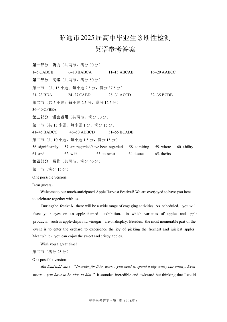 云南省昭通市2025届高三上学期1月诊断性检测英语答案