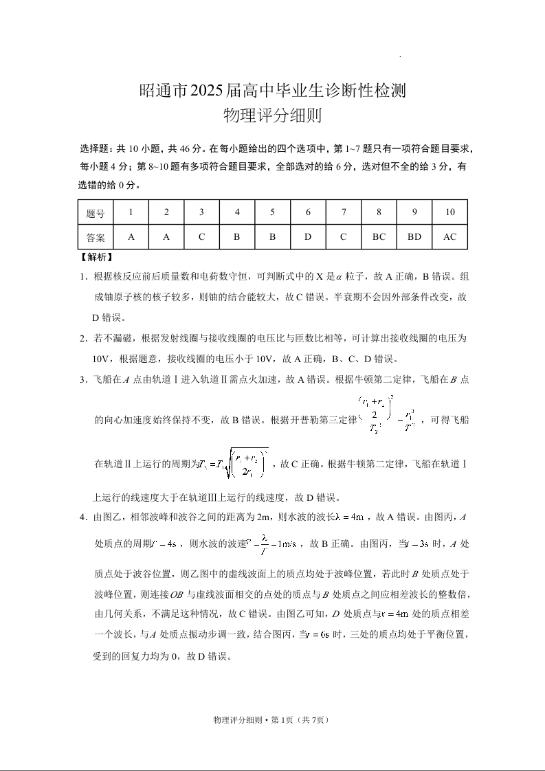 云南省昭通市2025届高三上学期1月诊断性检测物理答案