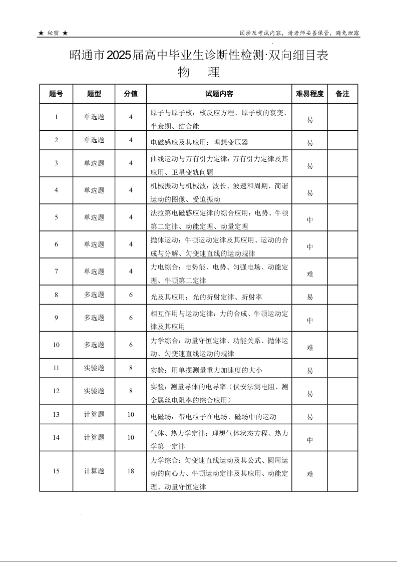 云南省昭通市2025届高三上学期1月诊断性检测物理双向细目表