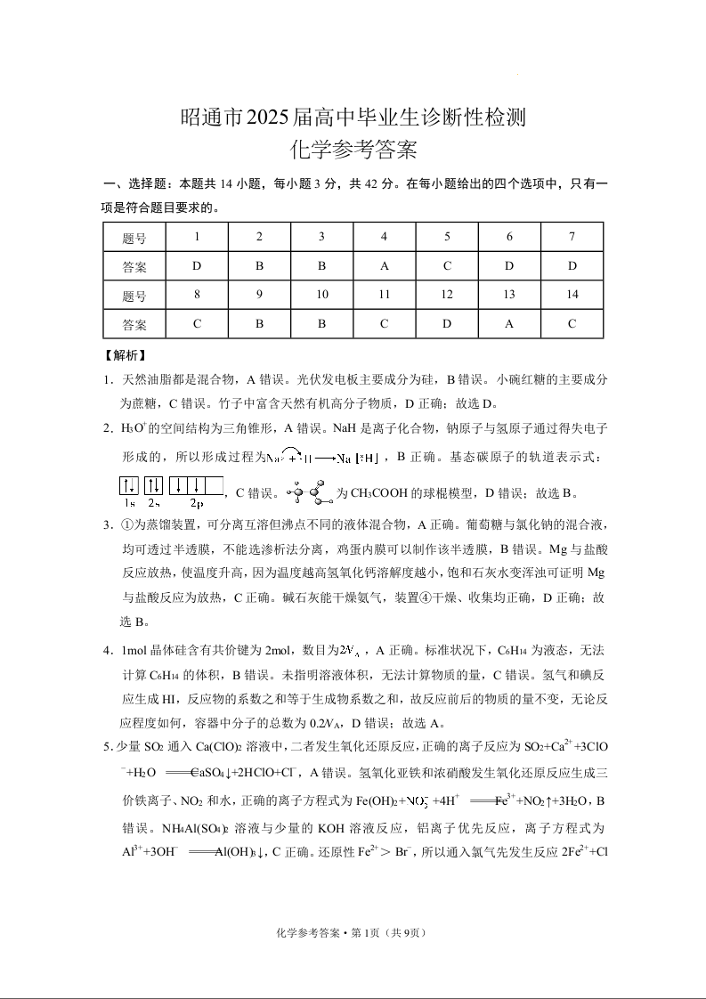 云南省昭通市2025届高三上学期1月诊断性检测化学答案