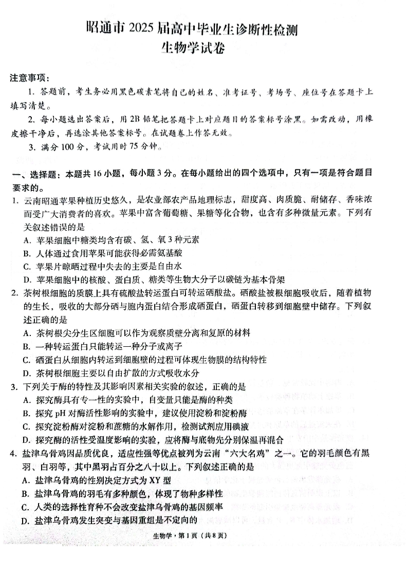 云南省昭通市2025届高三上学期1月诊断性检测生物