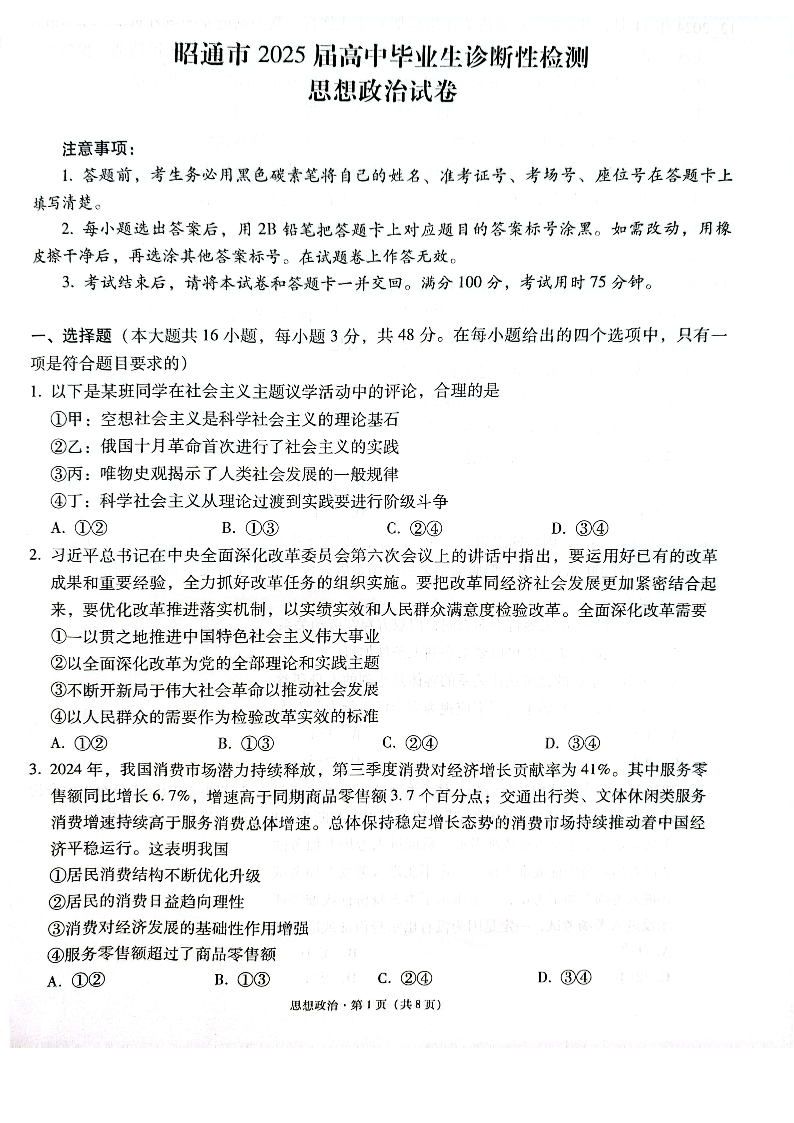 云南省昭通市2025届高三上学期1月诊断性检测政治