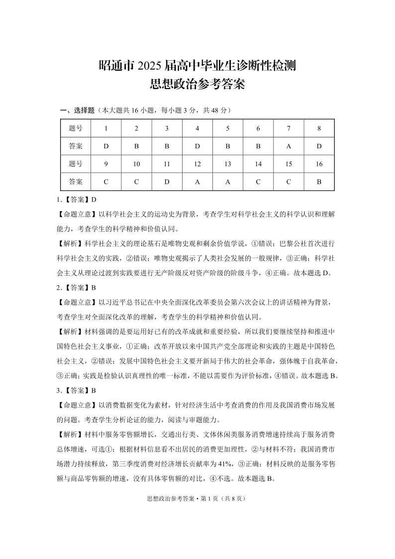 云南省昭通市2025届高三上学期1月诊断性检测政治答案