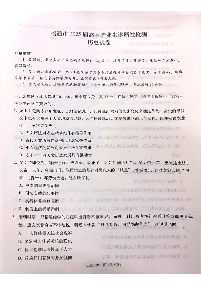 云南省昭通市2025届高三上学期1月诊断性检测历史