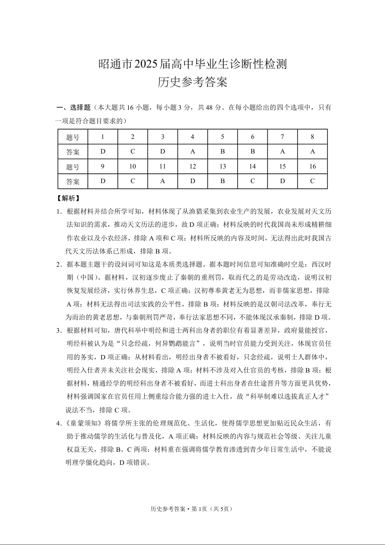 云南省昭通市2025届高三上学期1月诊断性检测历史答案