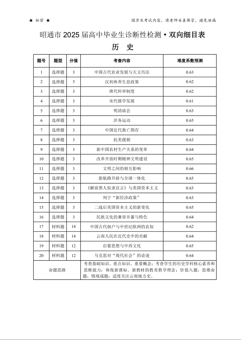 云南省昭通市2025届高三上学期1月诊断性检测历史双向细目表