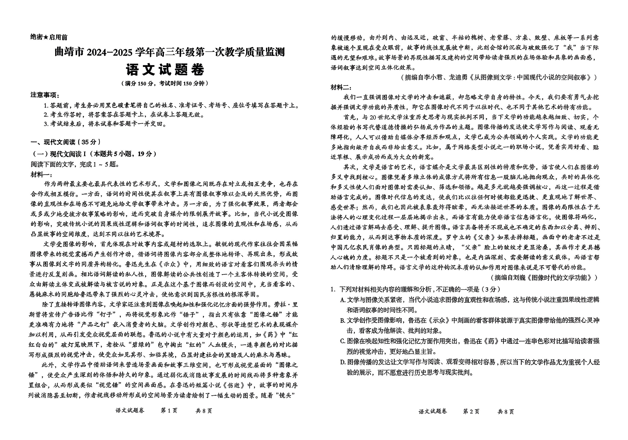 云南省曲靖市2025届高三上学期第一次教学质量监测语文