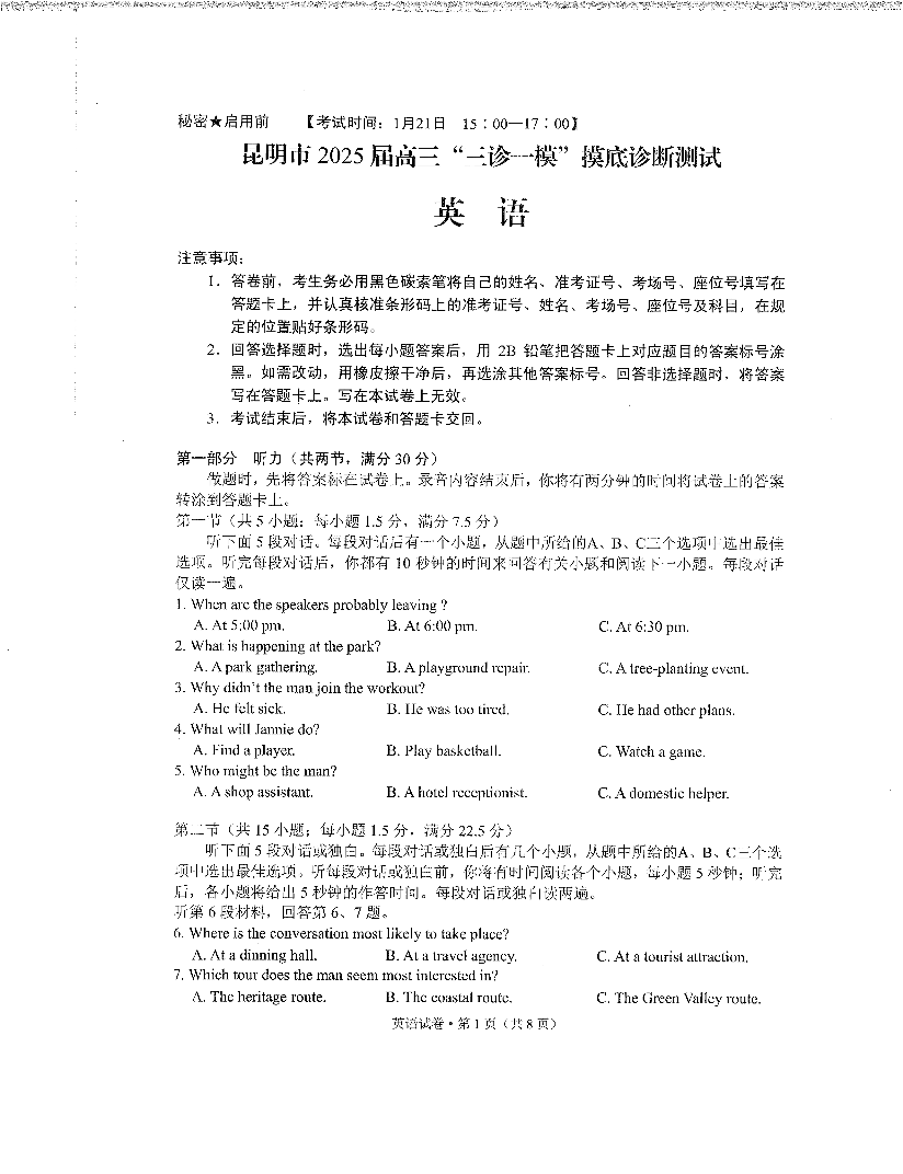 云南省昆明市2025届高三“三诊一模”1月摸底诊断测试英语