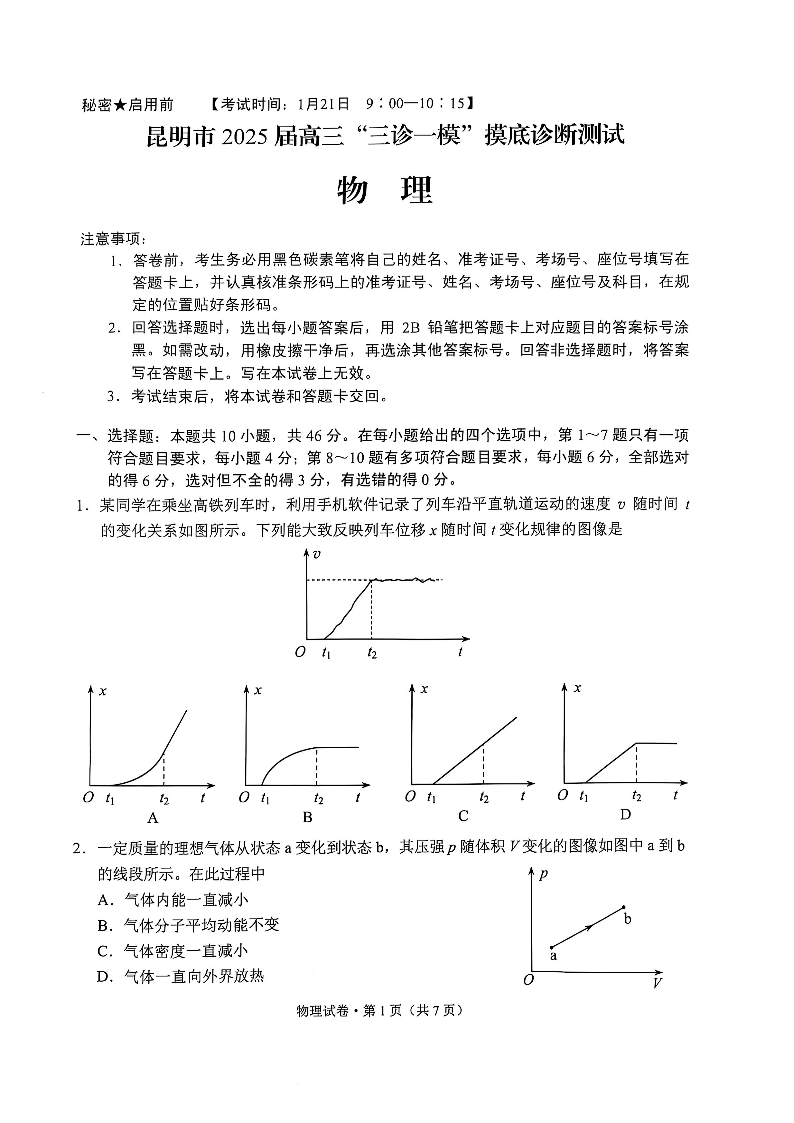 云南省昆明市2025届高三“三诊一模”1月摸底诊断测试物理